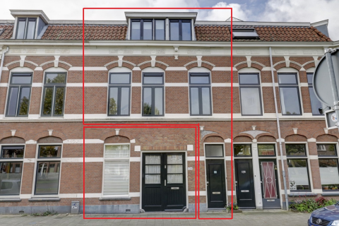 We gaan naar binnen waar eerst de gang met de granitovloer en de metrotegels aan de wand ons verwelkomen. De twee paneeldeuren naar de voor- en achterkamer maken het geheel af. De voorkamer is nu ingericht als muziekkamer met twee ramen aan de straatzijde, een suitekast en een hoog plafond. Via de suite lopen we de achterkamer in met openslaande deuren naar de tuin, een suitekast en een fraaie hoge schouw. Aan de achterzijde in de uitbouw kom je in de keuken die is voorzien van een net hoekopgesteld keukenblok. Hier is ook een de deur naar de achtertuin. In de achtertuin staat nu een hele grote houten berging. Als je deze verwijdert heb je een prachtige tuin met goede zonligging. Weer terug in de woning hebben we als laatste nog een toilet op de begane grond.